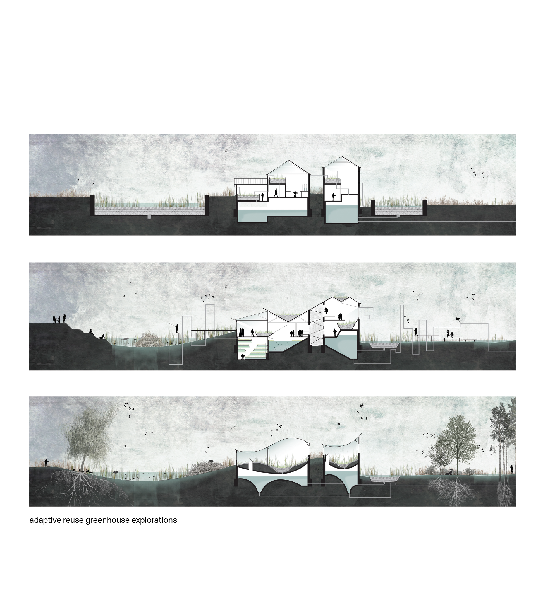 Crabtree’s studio project showcased how the land and structures could be retrofitted using green stormwater infrastructure to collect, store, and use for urban gardening purposes. The project demonstrates multiple scales of interventions from the single parcel rain garden, to the multiple parcel retention pond, to the largest intervention, a collection of 30 vacant parcels demonstrating how the infrastructure can become a public space.