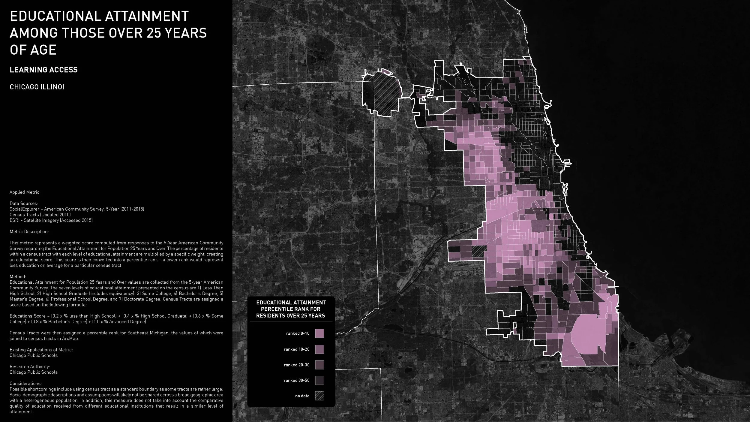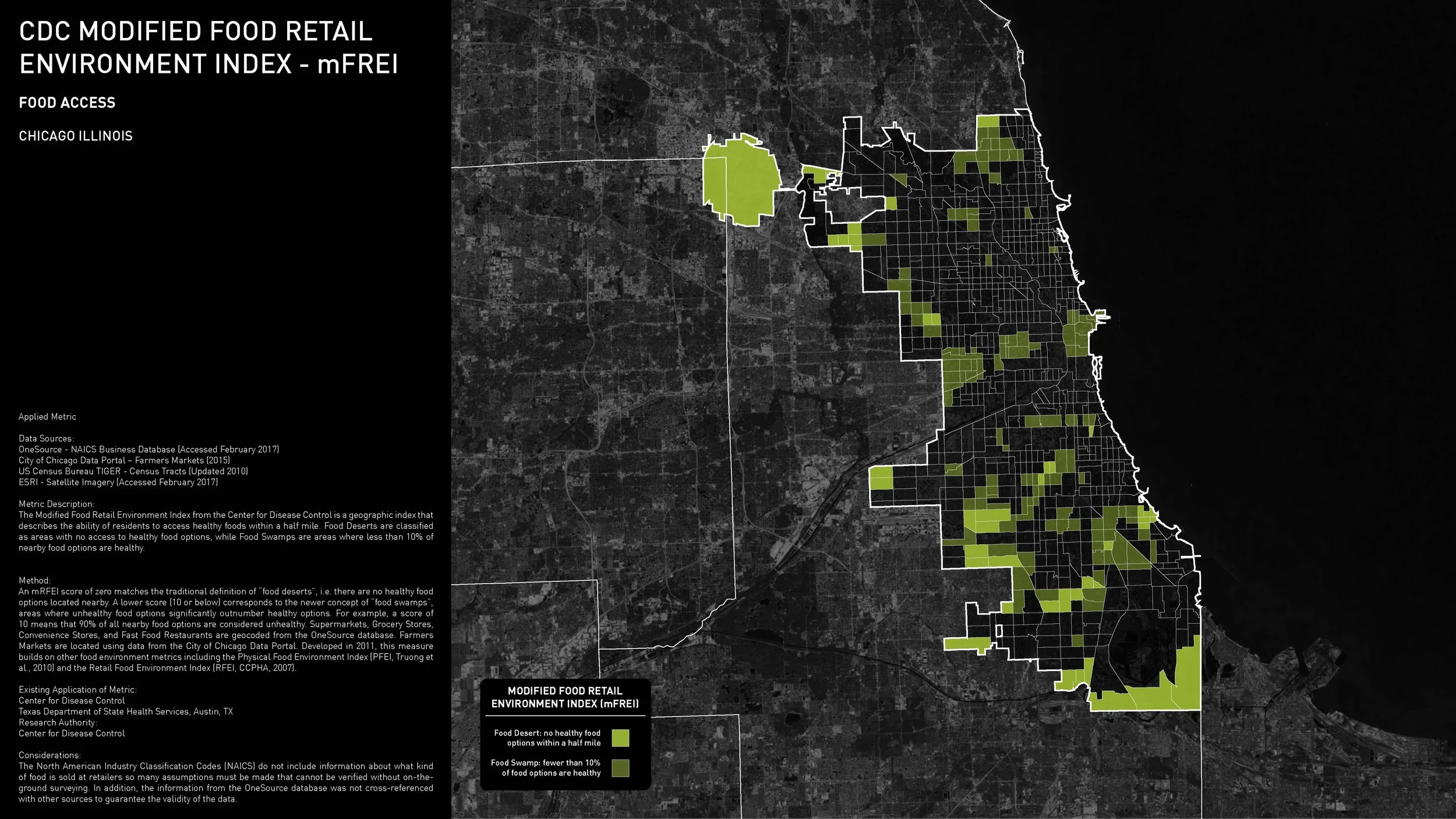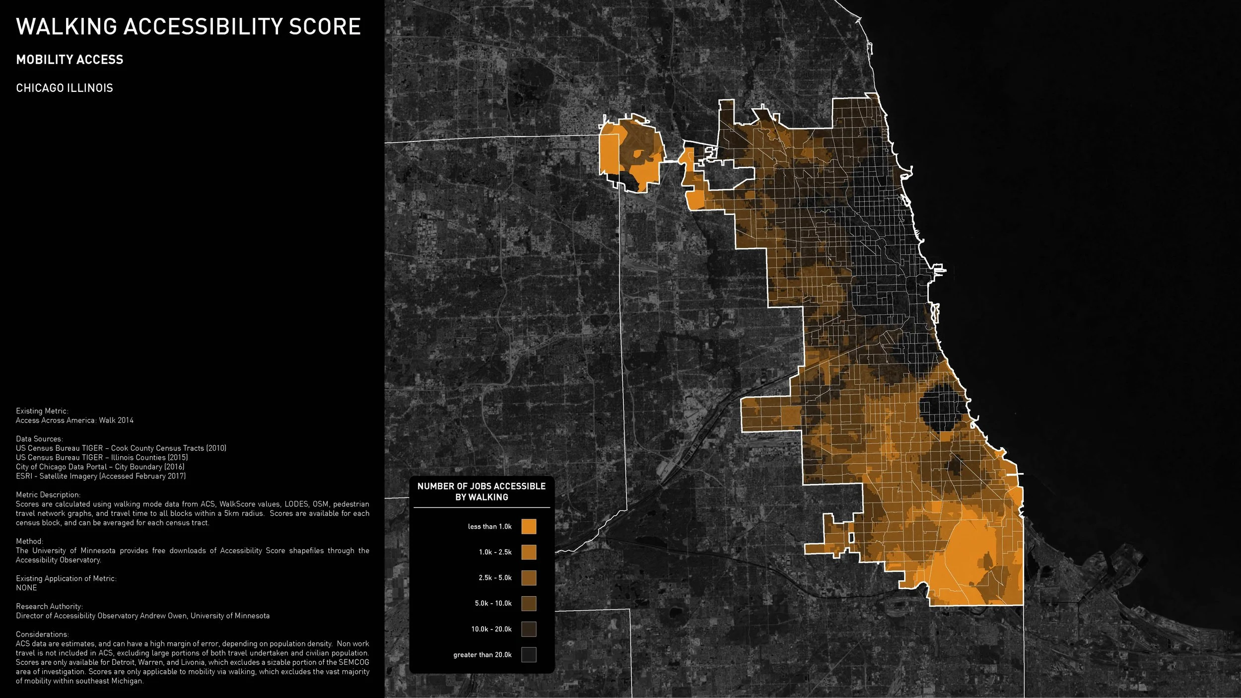 The work focused on collecting and analyzing GIS data at the city and regional scale for Detroit, Chicago, and San Francisco. We examined and visually represented food, health, learning, and mobility data sources to better understand areas in need of better access.